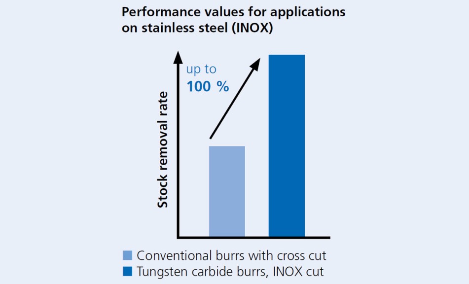 In addition, compared to conventional cross-cut burrs, the INOX cut features a 100 % higher stock removal rate when used on stainless steel.