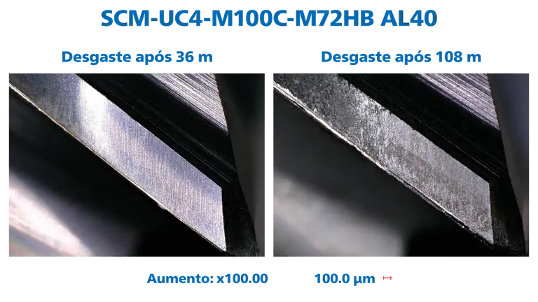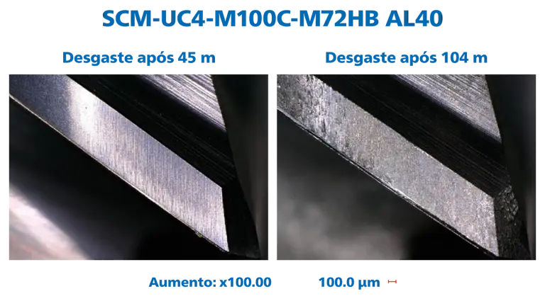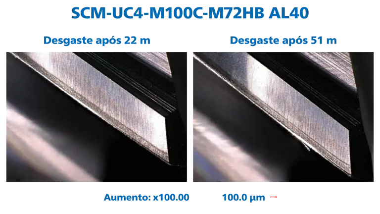 Sujeitámos nossos cortadores quádruplos SCM-UC4-M100C-M72HB AL40 a um teste de desempenho em diversos materiais e medimos, após o tempo de intervenção definido, a largura da marca de desgaste.