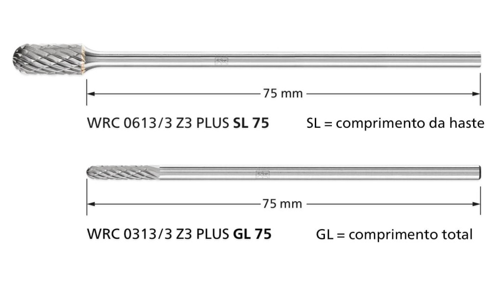 GL designa o comprimento total de uma lima maciça de carboneto de tungstênio. SL designa o comprimento da haste de uma lima de carboneto de tungstênio com haste longa de aço.