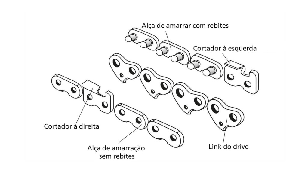 A corrente de motosserra é constituída por elos de corte, elos de ação e elos de união.