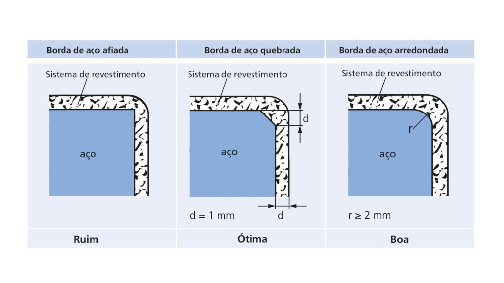 As bordas arredondadas, por sua vez, garantem que o revestimento seja aplicado de modo uniforme, com uma espessura suficiente. Sendo assim, todas as bordas afiadas de um componente devem ter suas rebarbas eliminadas, perder o corte e, idealmente, ser arredondadas com um raio de ≥ 2 mm.